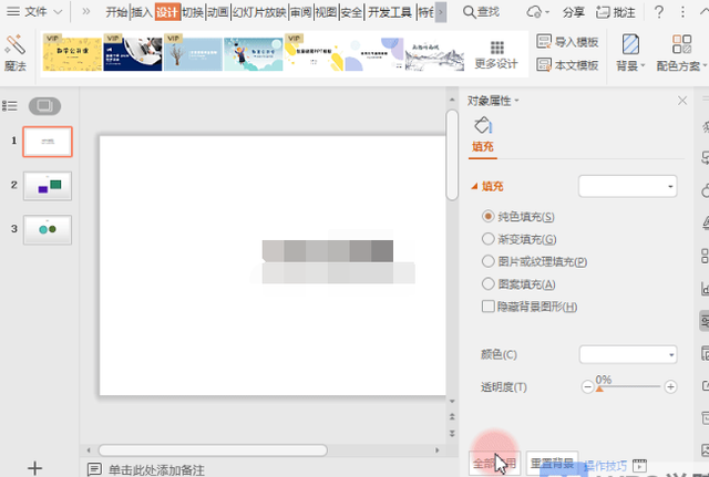 接着点击“全部应用”,即可将背景色应用到整个幻灯片啦~