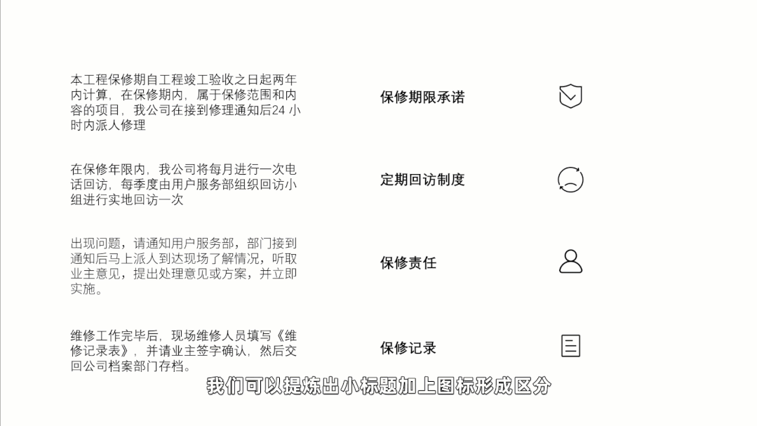 一是,当页面中都是文字时,可以提炼出小标题加上图标形成区分,特别是在使用栅格法排版的时候。