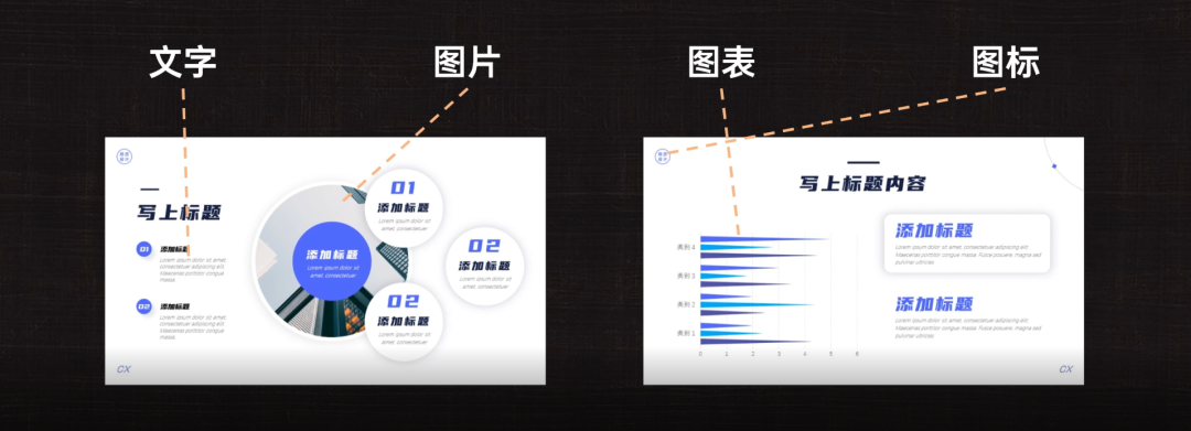 文字、图片、图表、图标等。