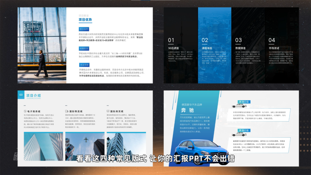 给大家科普完内页之后,我们进入正题,高效制作工作型PPT的方法就是:利用内页的四个经典版式,让你的PPT不出错。
