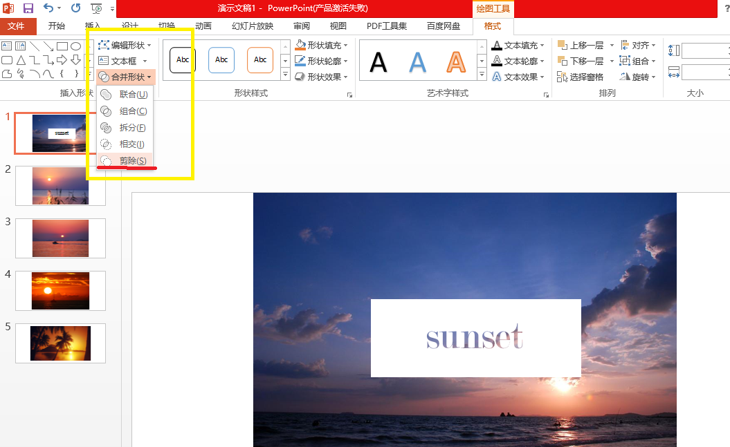 点击【格式】-【合并形状】-【剪除】