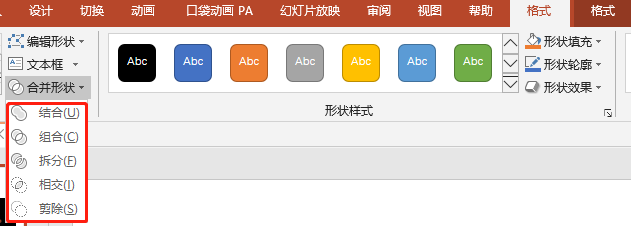 布尔运算跟数学运算有点像~指的就是PPT中的合并形状工具:结合,组合,拆分,相交,剪除。