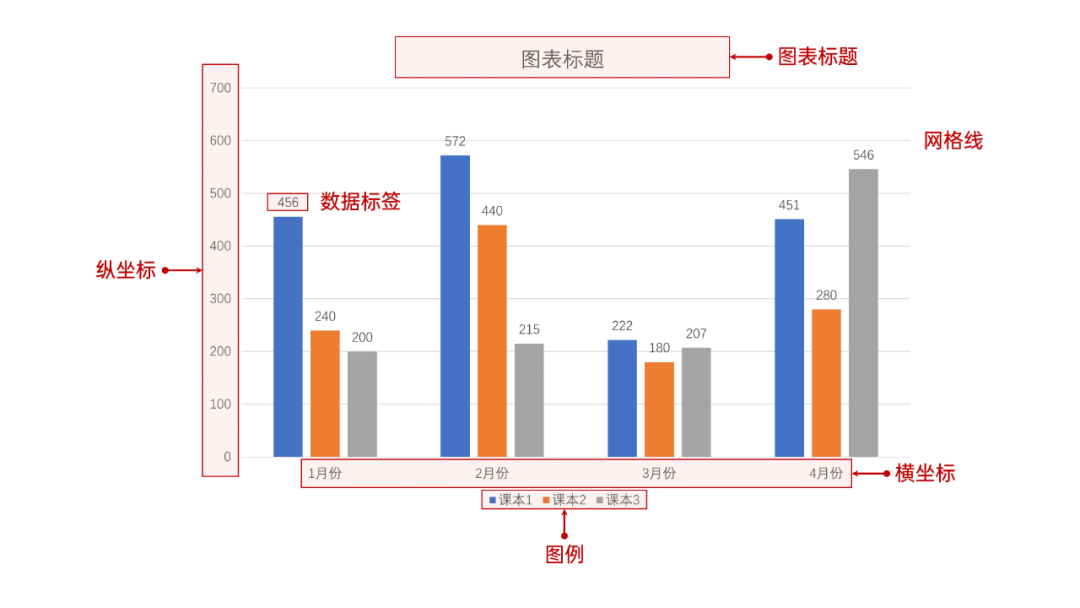 大多数情况下,图表主要的元素包括:图表标题、(横/纵)坐标轴、网格线、数据标签、图例。