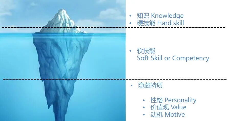冰山模型是一个常用来对自我能力盘点的工具,在水面以上的部分是看得见且容易辨识的“知识和技能(也叫硬技能)”,这部分可获得性时间较短,例如制作PPT的技能;水面以下是能力部分(也叫软技能),这部分需要长时间的练习、积累和总结,例如影响力或辅导能力等。