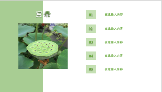 添加一张空白的幻灯片,在插入形状中添加长方形图形,找到合适的图片,设置图形颜色使两者相衬,根据自己汇报的内容在右部分设置类别,再加上文字格式的小设计,目录页就完美啦!