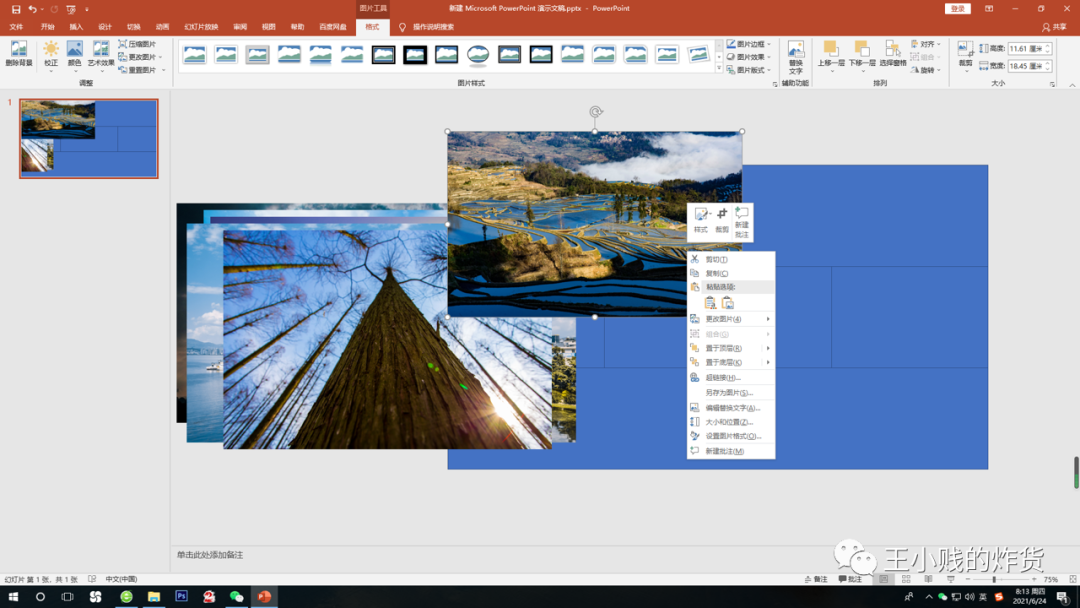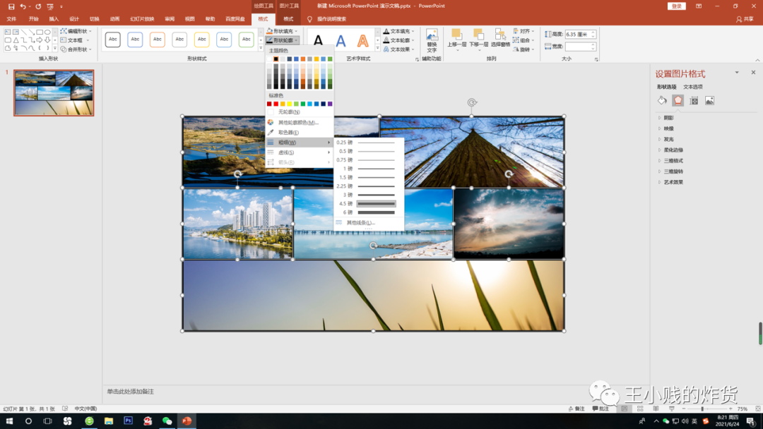 这一步重复操作比较多,如果有插件,可以利用插件直接进行排版,主要是形状格式的运用和自我排版的习惯;在图片排版之后建议添加边框设置,可以让图片更加有质感