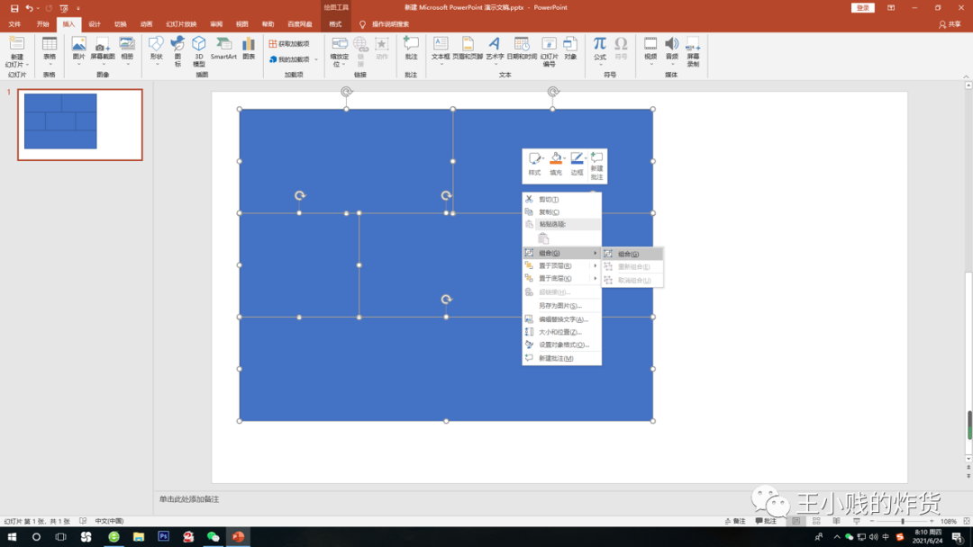 【插入】-【矩形】-按住【ctrl】进行多次复制-【将矩形整合排列成大的矩形框】-右【键组合所有形状】-【将组合框拉成ppt大小】