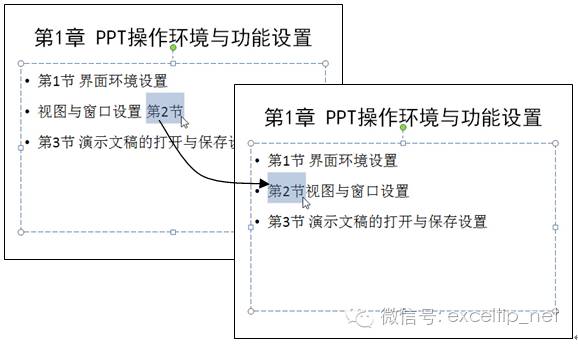 在输入与编辑幻灯片内容的过程中,有时发现内容的先后顺序需要调整,这些内容有的来自同一张幻灯片,有的则来自于不同幻灯片。是否可以直接移动文本的位置而不用重新输入?