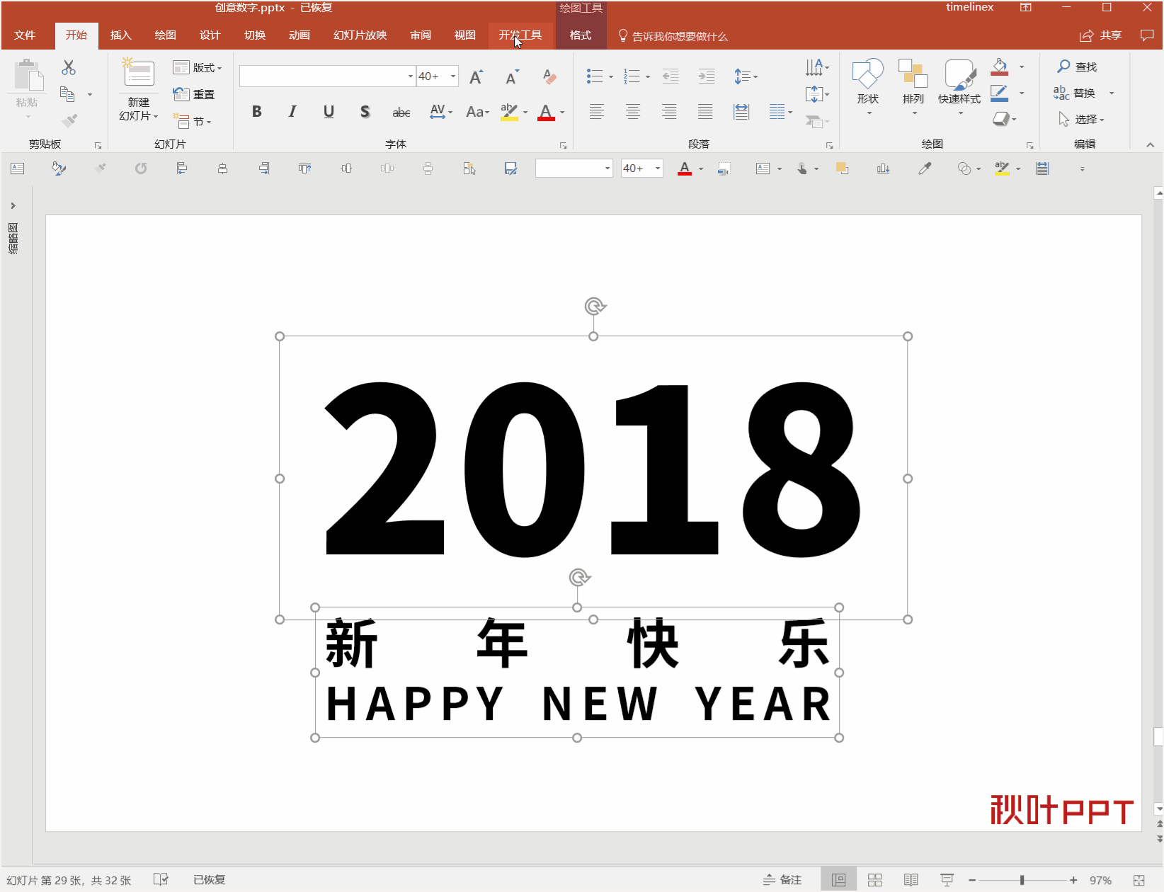 我们不妨就以 2018 这个数字为引,为大家讲解一下如何利用 PPT 软件自带的功能制作出高大上的文字效果。