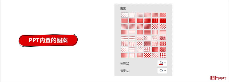 文字填充还有最后一种模式——图案填充,PPT 内置了多种图案样式可以填充进入文本,图案还可以自定义前景色和背景色。