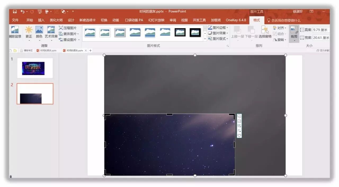 选图中有深蓝色星空 + 光照,但是光照太多,与「时间的朋友」PPT背景有些不一致,为了减少光照增加星空效果,可以通过PPT中图片的「裁剪」功能,将选图的左中部分剪裁出所需的背景效果。