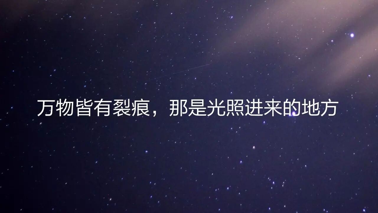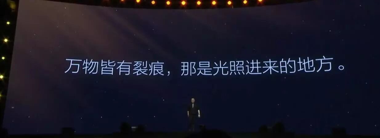 此次罗胖的演讲PPT背景为深蓝色星空,点缀适当的光照,现场效果和直播效果都很好:深色保障了视觉体验,星空契合跨年演讲回顾过去展望未来的主题,光照不仅展现点缀星空之美,更是贯穿背景始末引出「万物皆有裂痕,那是光照进来的地方 」,可见背景的设计用心良苦!