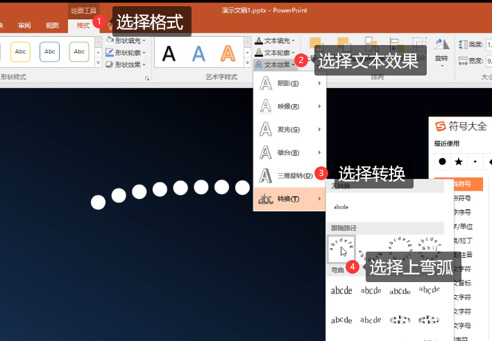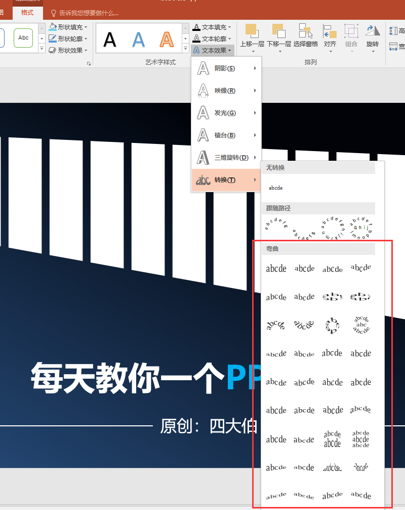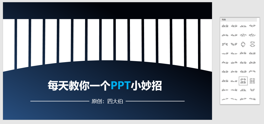 我们可以现在文本框里插入一些方块。然后在文本效果的转换效果列表中,找到很多弯曲效果。