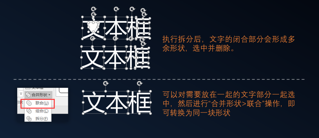 同时选中文本框和另一个插入的任意形状,依次在菜单栏选择:绘图工具·格式>合并形状>拆分。