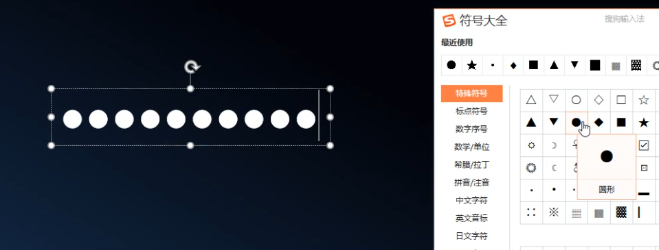 而实际上这个功能还有一个隐藏小妙招——当我们插入特殊字符后,可以用文本转换形状功能绘制各种形状组成的圆圈——