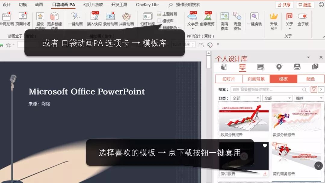 点击口袋动画PA选项卡中的模板库,可以选择喜欢的模板,点击下载即可一键套用