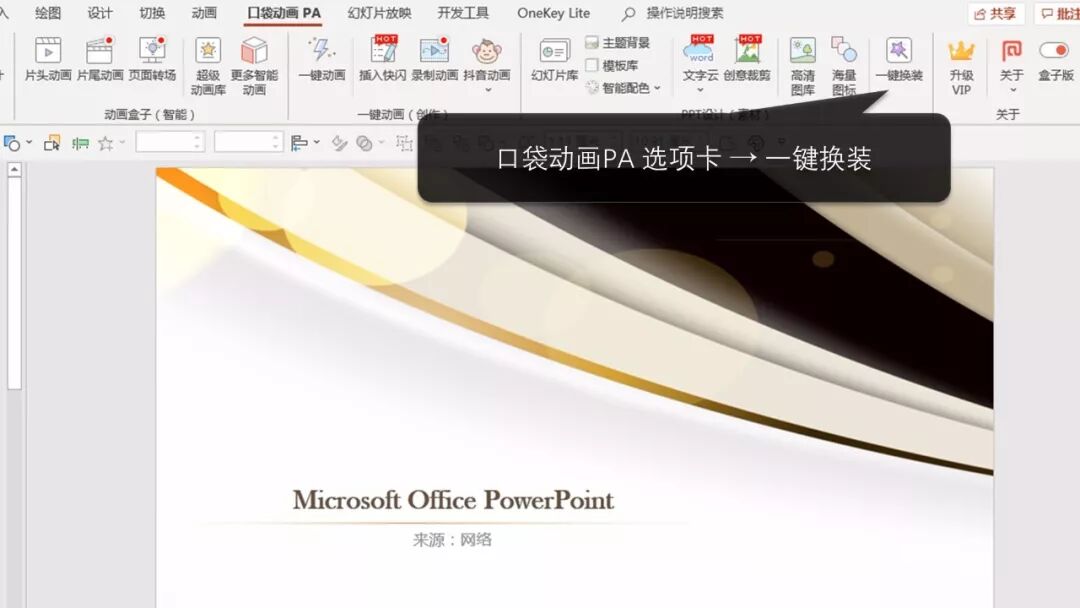 点击口袋动画PA选项卡中的一键换装,模板会自动套用。如果不满意可以多点几次