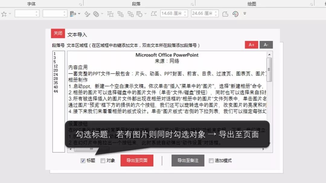 勾选标题复选框,点击导出至页面按钮。如果内容中有图片,记得把对象复选框也勾选上