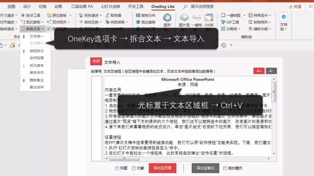 在PPT中点击OK插件选项卡,找到拆合文本菜单下的文本导入。然后Ctrl+V粘贴到文本区域框中