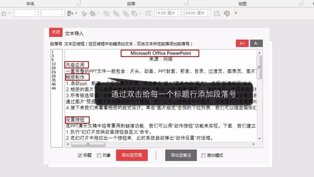 在每一个需要粘贴到标题占位符的文本行上双击,段落号会添加到左侧的段落号框中。也可以手动回车添加1个空行,然后在空行上双击添加段落号。那么导出后标题占位符就是空的,此方法适合拆分字数较多的内容