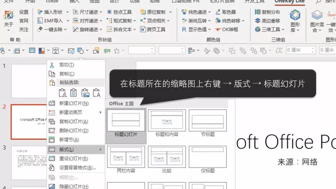 在封面所在的缩略图上右键,修改版式为:标题幻灯片