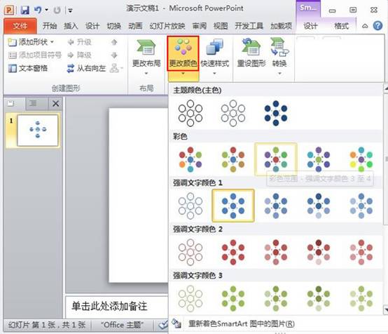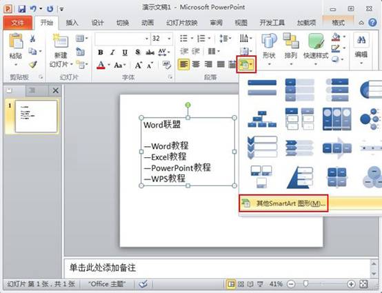 ① 打开PowerPoint 2010,编辑文字,选中文本框,单击开始菜单里面的转换为SmartArt图形按钮,如图1所示。