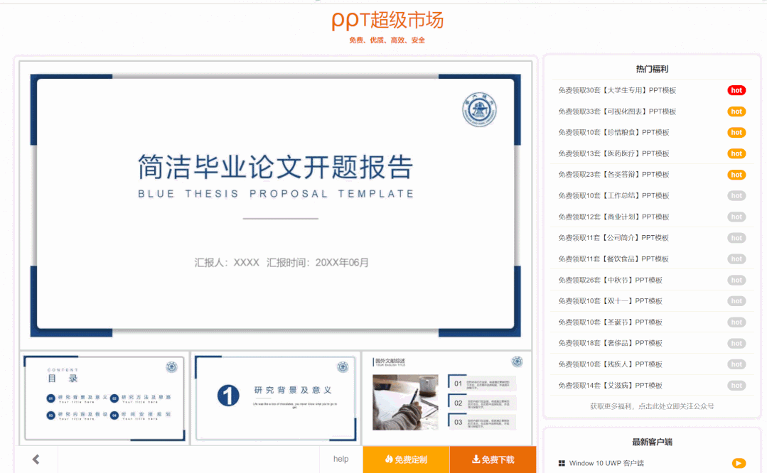 比如在搜索框中输入“答辩”,则会弹出大量优质免费的论文答辩模板: