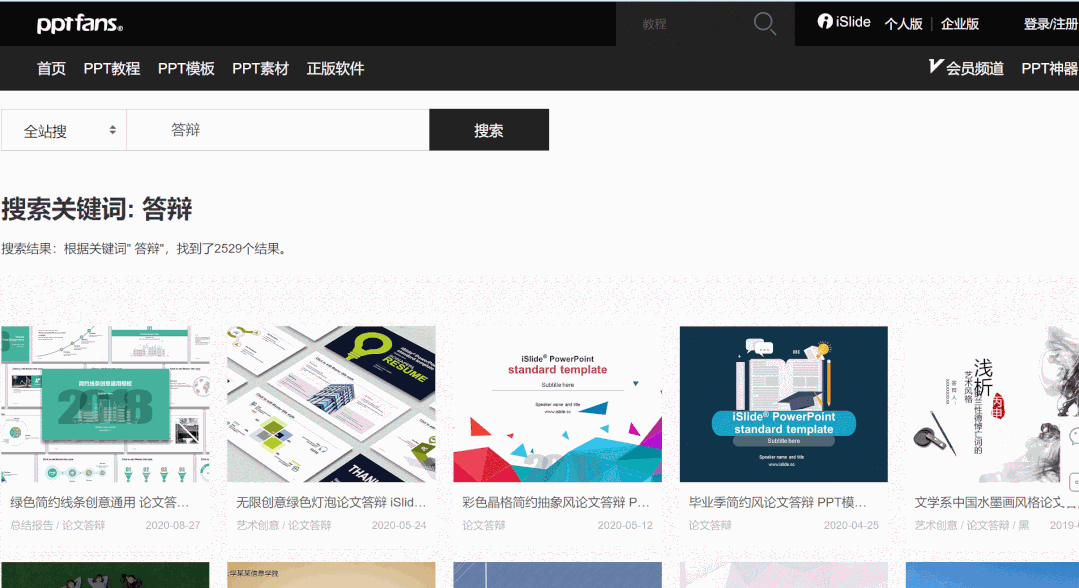 pptfans(http://www.pptfans.cn/)也有海量的PPT模板可以免费下载。比如搜索“答辩”,即会弹出大量的优质毕业答辩模板: