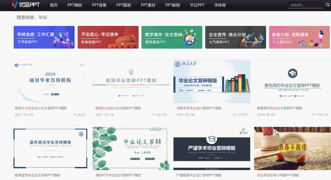 上面这个网站非常直截了当,没有多余的装饰和广告,PPT质量很高,而且是完全免费的,毕业答辩、工作汇报、入职报告缺模板?来这里肯定能找到中意的。