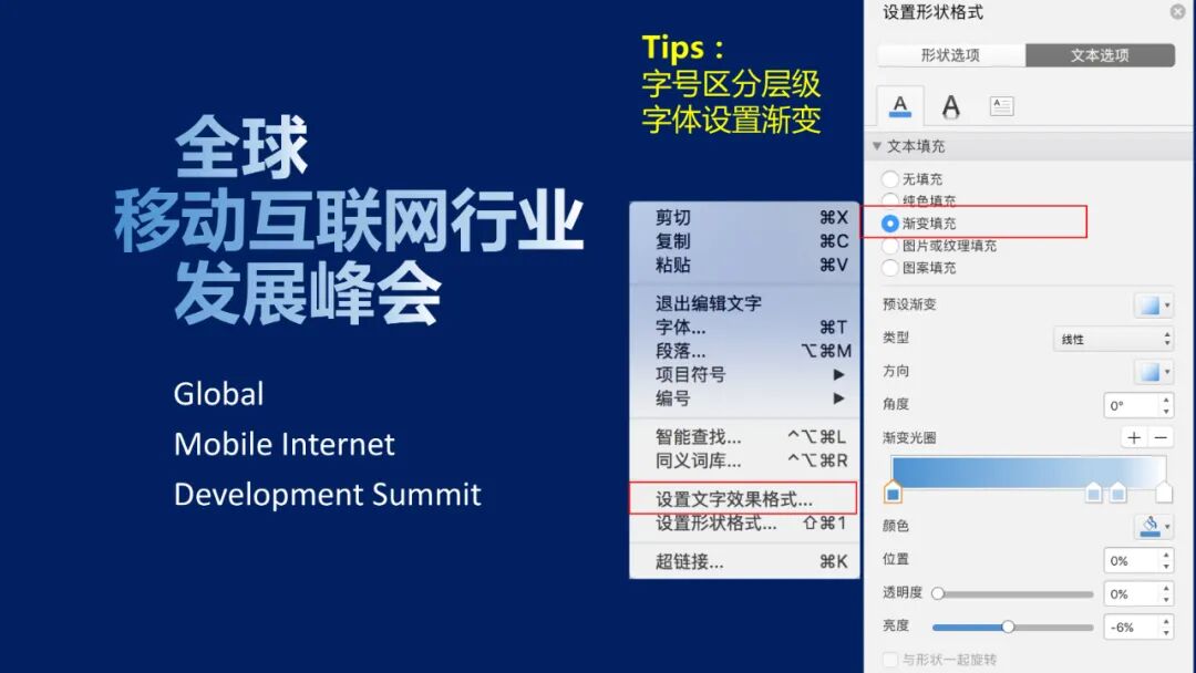 选中文字——右键——设置文字效果格式——文本选项——文本填充——渐变填充