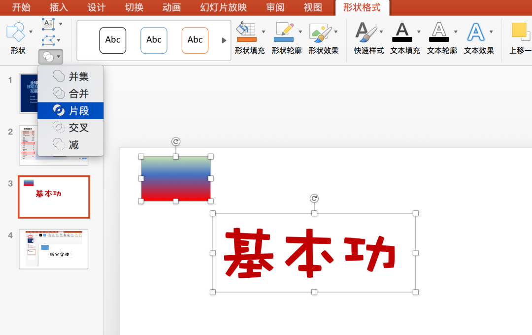 选中文本框中文字调整字体字号(相当于设置片段形状大小)——插入形状:矩形——设置矩形形状格式(相当于设置片段颜色和边框)——同时选中矩形和要拆分文字的文本框——单击形状格式选项卡下合并形状工具中的片段选项