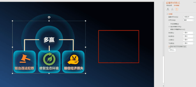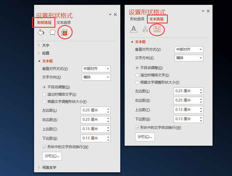 上图中,我们可以看到分别在形状设置和文本设置两个选项下,都可以找到文本框设置,它们功能一致且同步调整,没有任何区别。(这也佐证了在PPT中,文本框和形状是同一个东西。)