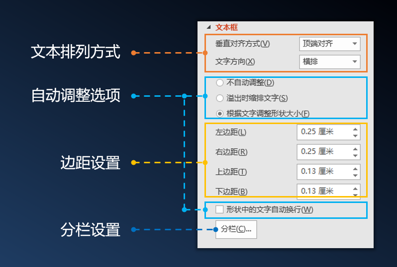 ▶ 自动调整选项:上部的三选一选项,和下方的勾选项,组成了调整文本框“自动调整”相关功能的选项。本期内容,我们会重点看看它们有何实际作用。
