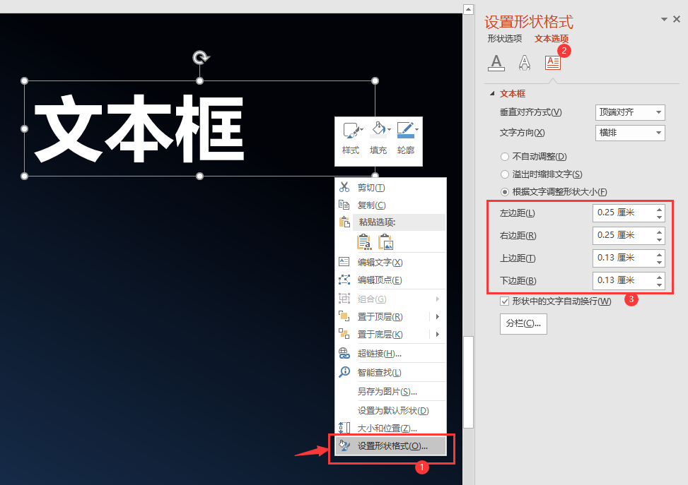 ▶ 边距设置:文本框边缘与文字之间,是有间隙的,在这里我们可以具体设置这个间隙有多大。这也是一个容易被新手忽略的设置项目,作为一个专业的PPT制作者,你需要掌控这些数据。