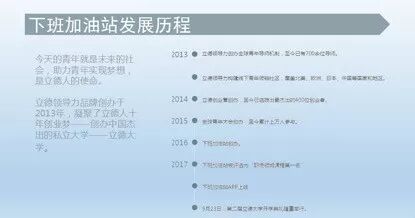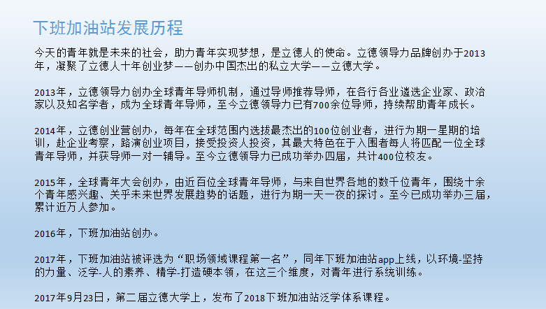 这是一个关于下班加油站发展历程的PPT页面,全是文字,排版一点美感都没有。看的人眼睛也受不了。唯一的亮点就是没有其他无关的装饰,标题和文章有色彩的对比。