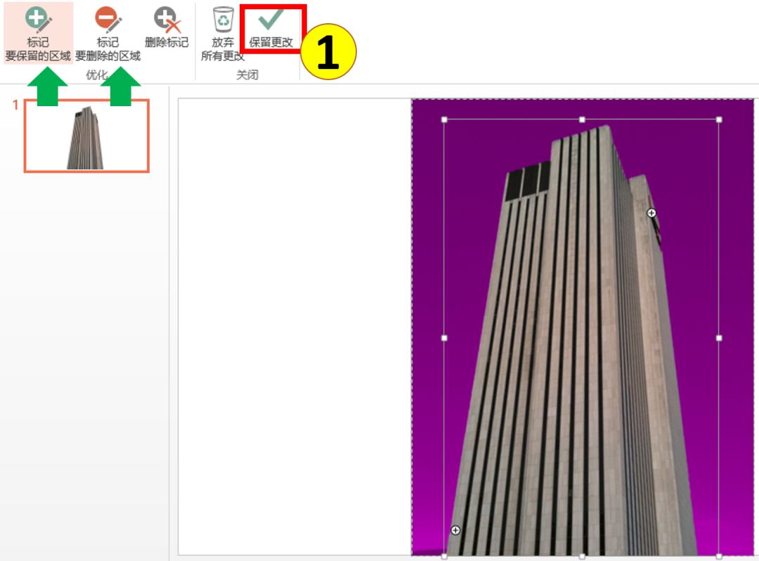 通过标记保留,删除区域按钮对图片进行适当剪裁,确认点击“保留更改”