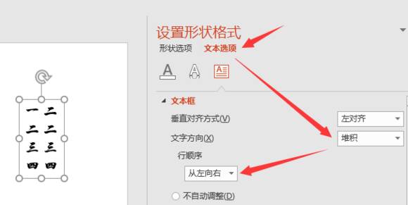 简易操作(选中文本框,右键设置形状格式,选择文本选项,文字方向选择堆积,行顺序选择从左到右):