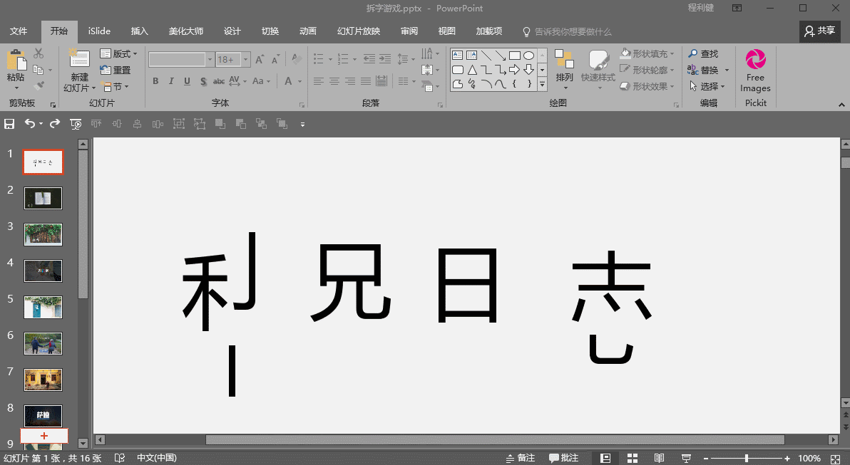 虽然PPT不是一个设计软件,但是随着功能的不断完善,拆字是完全没有问题的,用到的功能就是PPT中的布尔运算,又叫合并形状。