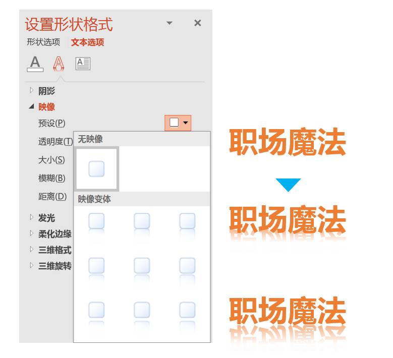 映像效果的添加同阴影效果的添加一样,在预设中根据需要选择即可,然后调节参数。映像效果主要让人产生背景有种镜像的感觉,和阴影一样,都是起到强调文字,增加PPT中文字排版的空间感。