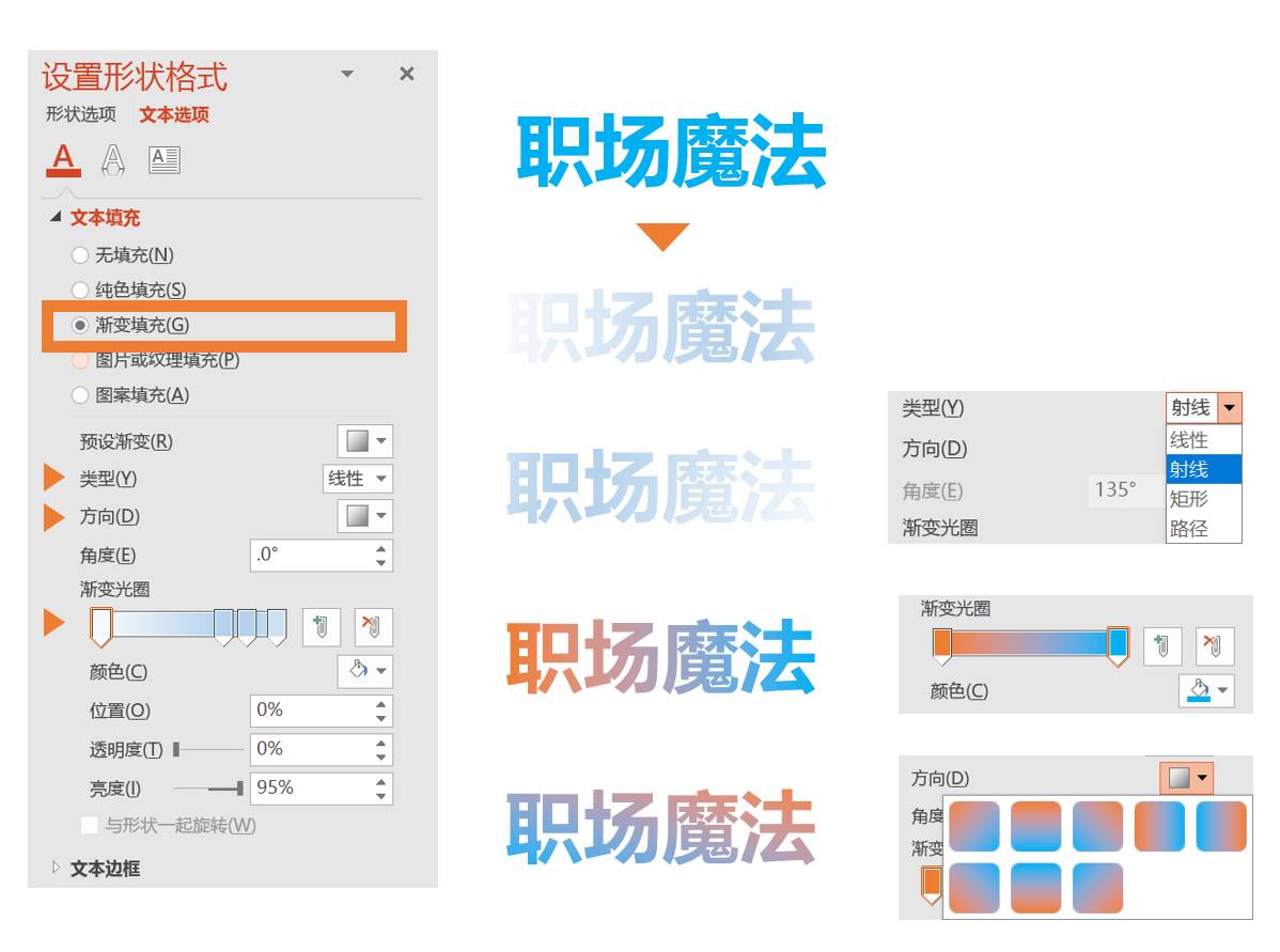打开设置形状格式,将原来的【纯色填充】变成【渐变填充】,我们可以看到纯蓝色的职场魔法就变成了渐变的职场魔法,切换到渐变以后,我们可以通过【渐变类型】、【光圈】和【方向】的调节改变参数得到自己想要的效果,如下图所示: