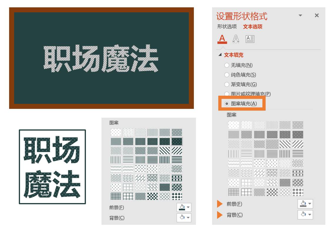 除了以上这两种文字效果之外,还可以使用【图案填充】,这种美化手法在做一些手绘风格的PPT中可以让文字变得更真实。