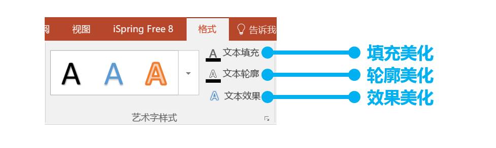 从字体的【格式】选项卡中我们可以看到,在Power point当中文字可以有三种美化手法让我们美化PPT中的文字: