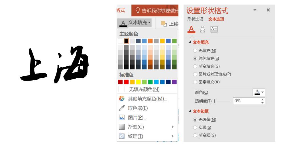 直接点开文字格式工具栏中的文本填充,在主题色或者标准色其他填充颜色中直接选取颜色点击即可。而在设置形状格式中则是点开文本填充框,在纯色填充中换颜色即可。