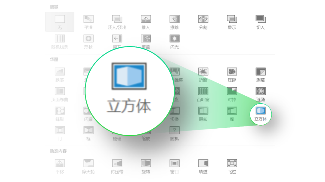 其实呢,对于这个动画效果,PPT 自带的切换效果就能快速实现!而这个切换效果,就是「立方体」。