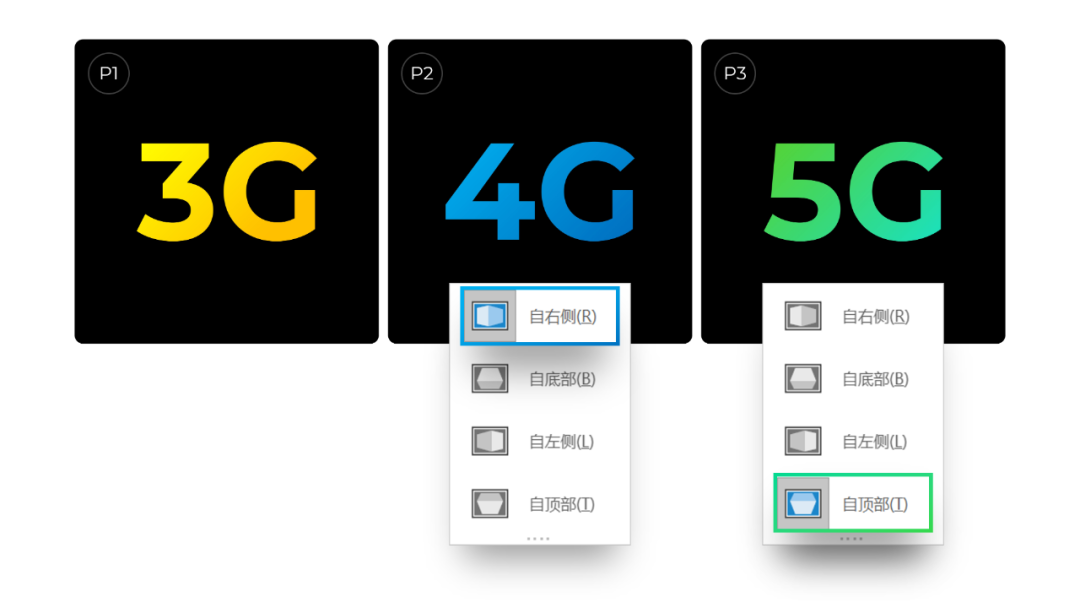 就像文章开头的 3G、4G 再到 5G,采用「飞过」的形式,也很不错。