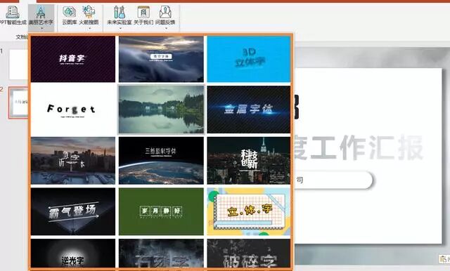 例如:我们先在PPT里面录入字体,然后点击{美丽艺术字}然后即可生成艺术字!