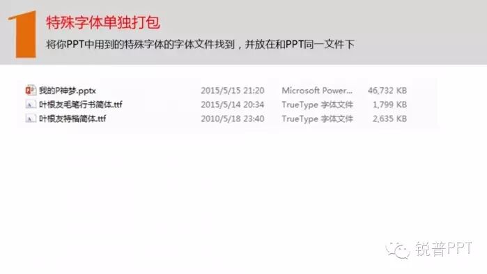 ▲直接将你使用的特殊字体的安装包打包和你的PPT文件放到一个文件夹里面,这个方法最简单、实用、粗暴。