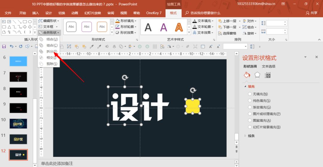 2.选中一个文字,在选中形状,进行布尔运算,选择拆分,后面的文字一次类推。