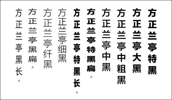 即便是方正兰亭黑体,也分出很多种样式。需要注意的是,其中的「扁」、「长」字体样式因为将中文的方块字做出了形变,阅读时是相对困难的,如不是特别需要,不建议使用。相对粗的用作标题字,细的用作正文字。