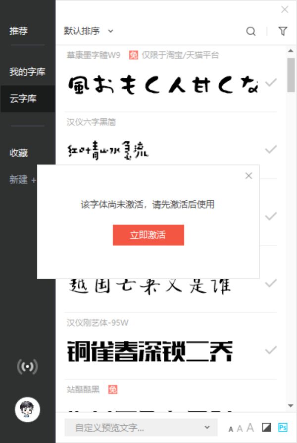 另外一种使用方法就是下载“字由”的客户端,客户端有Windows和Mac两种,下载完之后打开登陆一下,就可以使用了。一般看中哪个字体之后,可以直接点击然后激活,当电脑弹出激活成功的窗口,代表这个字体已经安装成功。